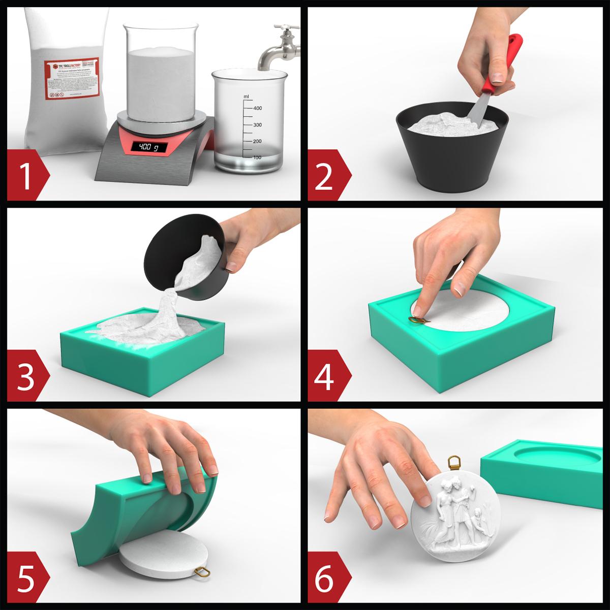 - Wasser vorlegen und Gipspulver langsam einstreuen, mischen, bis ein homogener Gipsbrei entstanden ist.