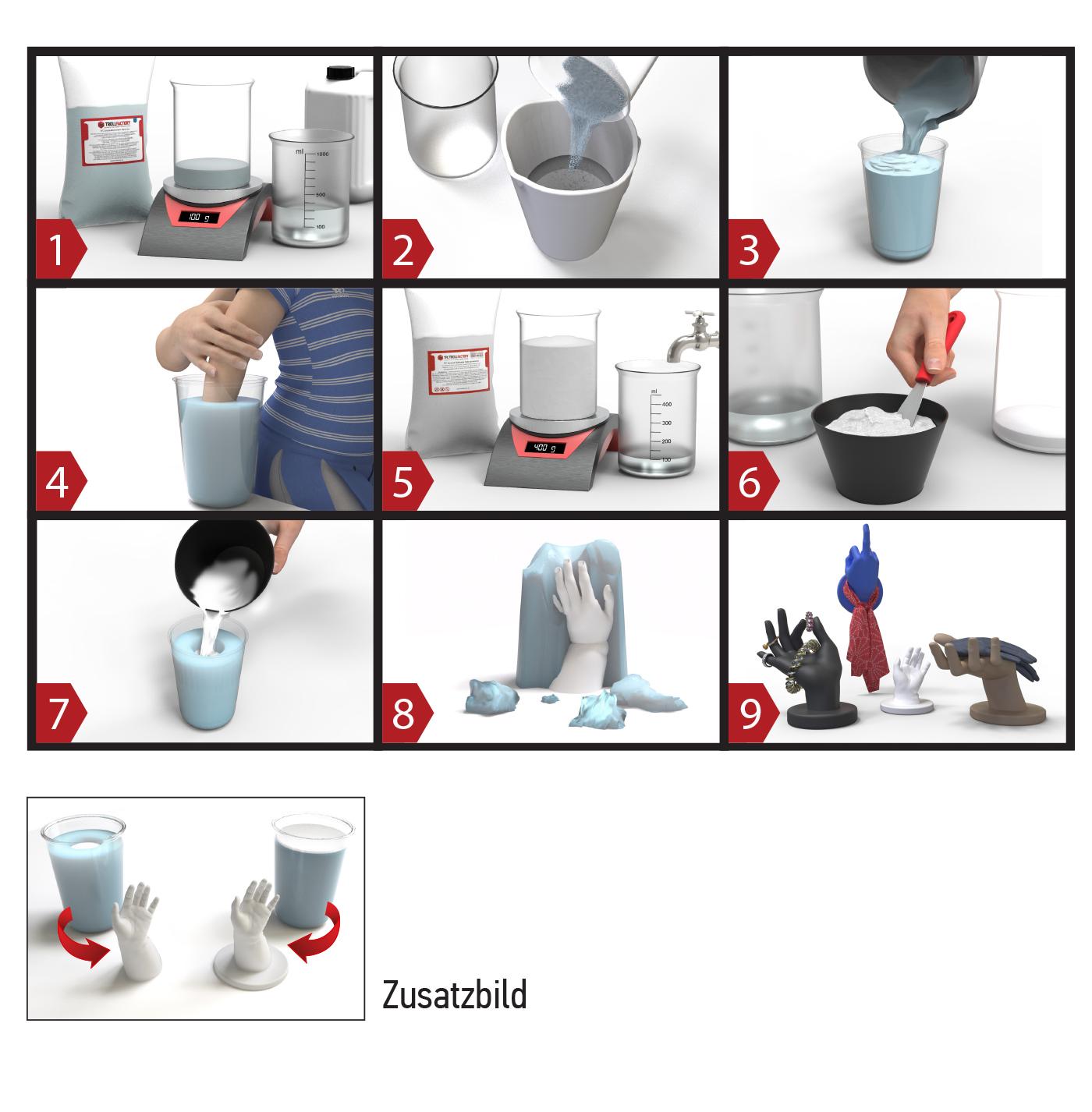 3-4 Teile Wasser, 1 Teil Alginat für eine flüssige, gießfähige Konsistenz