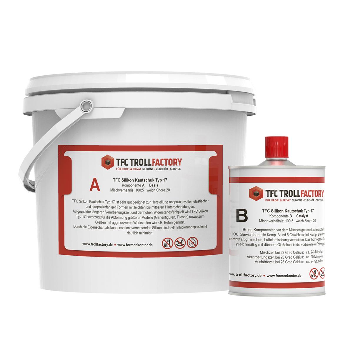 Aufgrund seiner günstigen Preisgestaltung, der längeren Verarbeitungszeit und der hohen Widerstandsfähigkeit wird TFC Silikon Typ 17 bevorzugt für die Abformung größerer Modelle (Gartenfiguren, Fliesen) oder auch zum Giessen mit agressiveren Werkstoffen wie z.B. Beton genutzt.