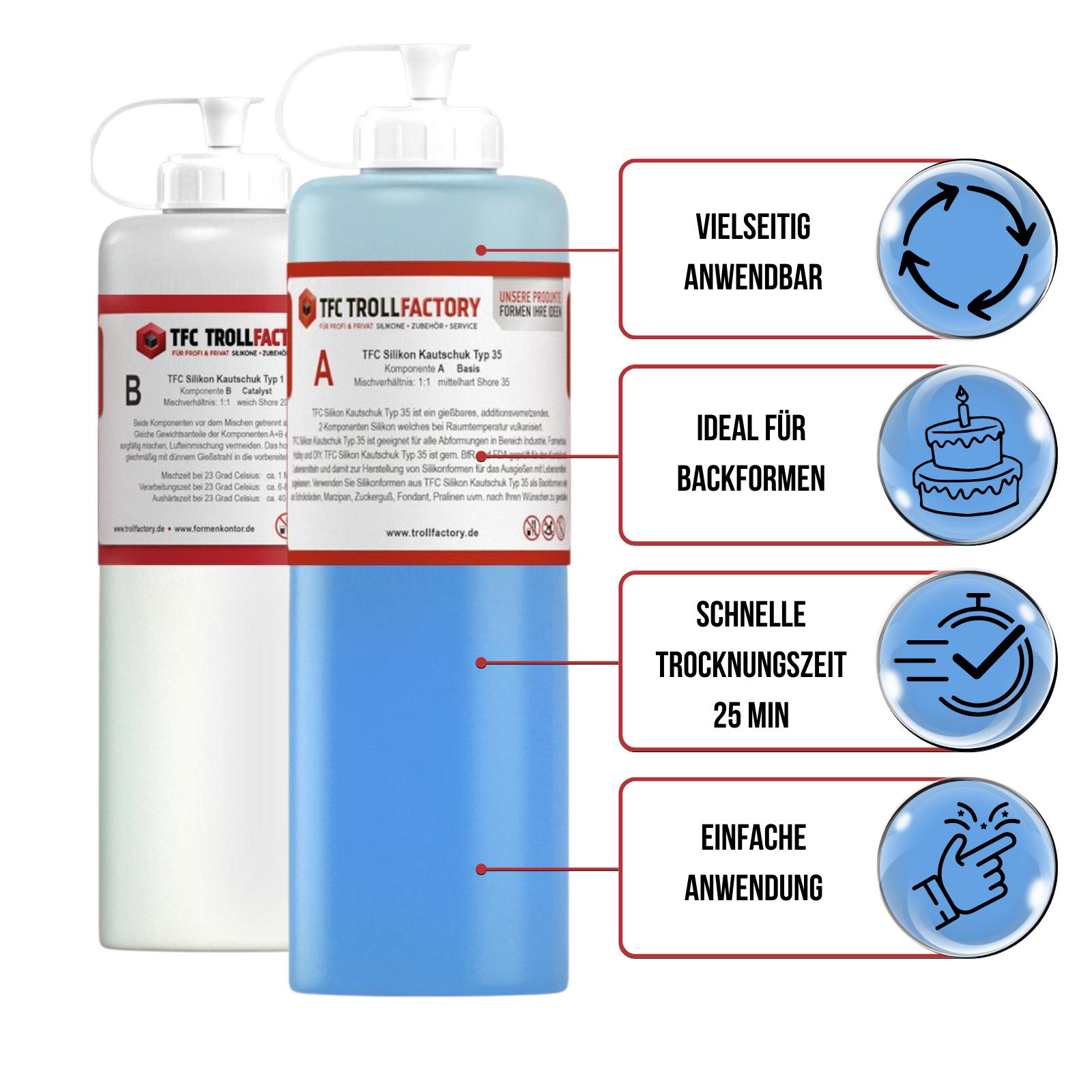 TFC Silikon Kautschuk Typ 35 ist BfR und FDA geprüft und somit für den Kontakt mit Lebensmitteln zugelassen und zum Ausgießen von Backformen, Schokoladenformen, Zuckerguss uvm. bestens geeignet.