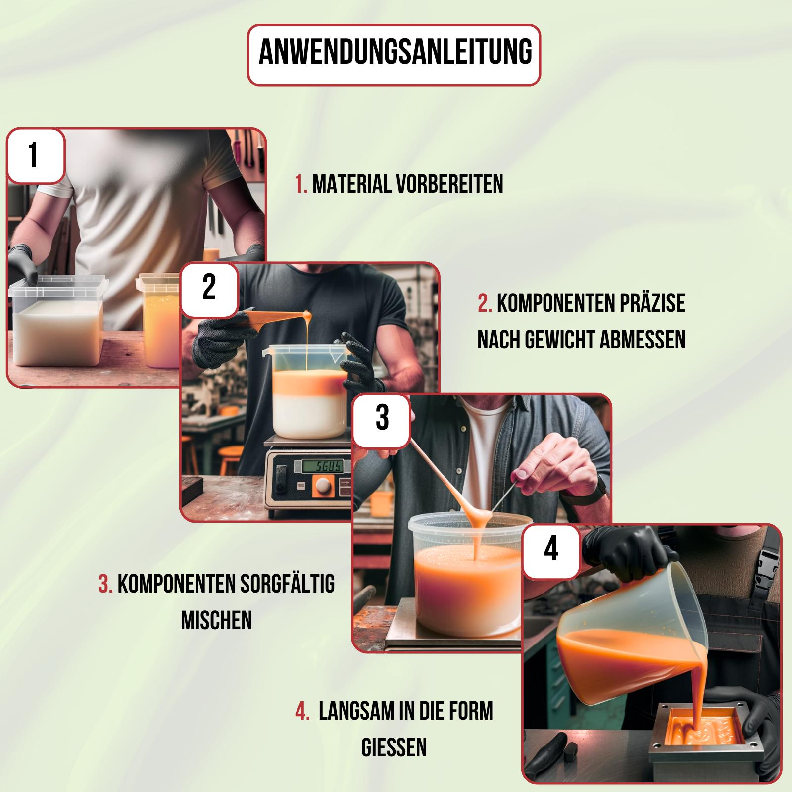 Hierbei sollten Sie vor dem Eingiessen die Form mit einem Trennmittel vorbehandeln,da Giessharze nach mehrmaligem Giessen zur Versprödung der Form führen können.